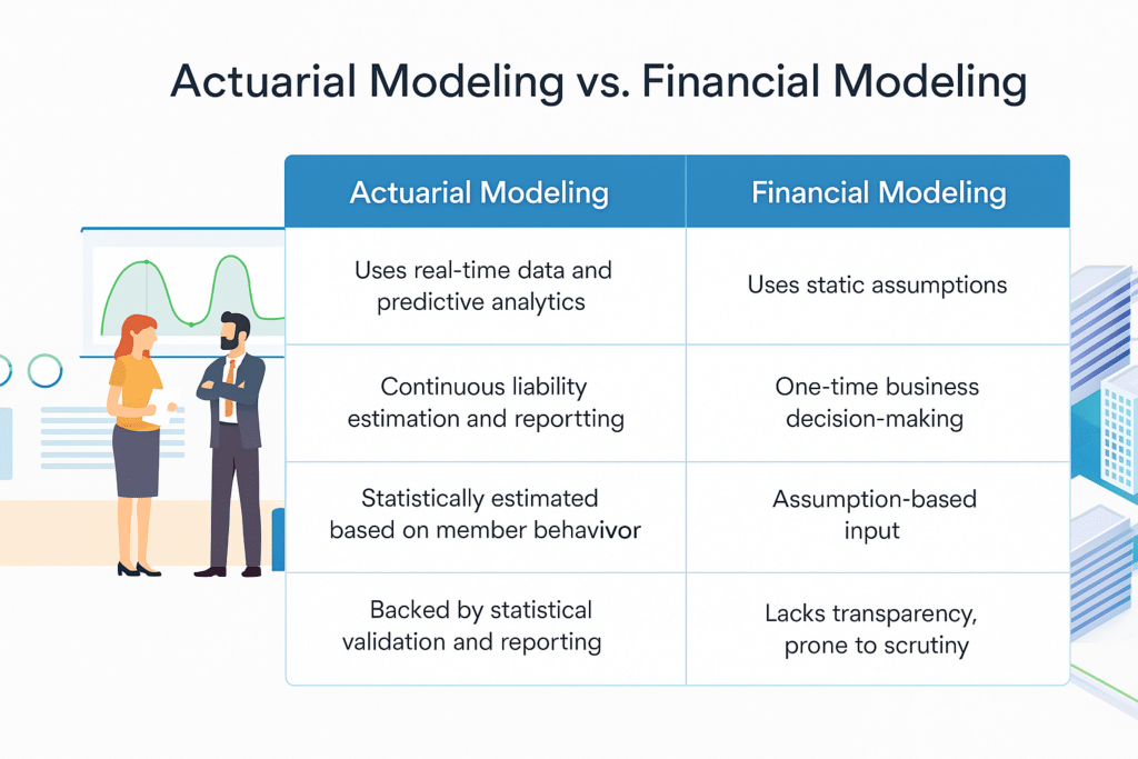 In this article, we’ll break down the differences between financial modeling and actuarial modeling, show why it matters for CFOs, and explain how an actuarial approach provides the accuracy and stability needed to avoid financial pitfalls.